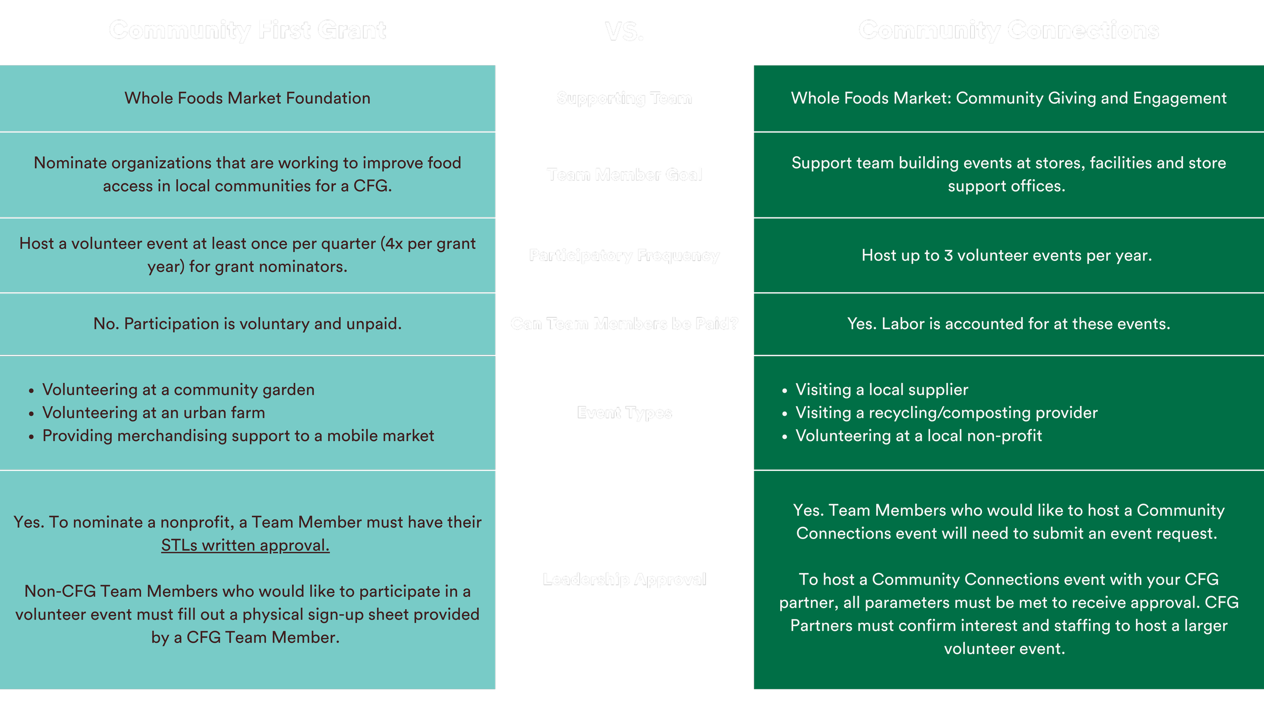 In 2024, Whole Foods Market launched Community Connections to support team building events at each location. While this sounds similar to the Community First Grant, they are separate programs. Learn more in the chart below.